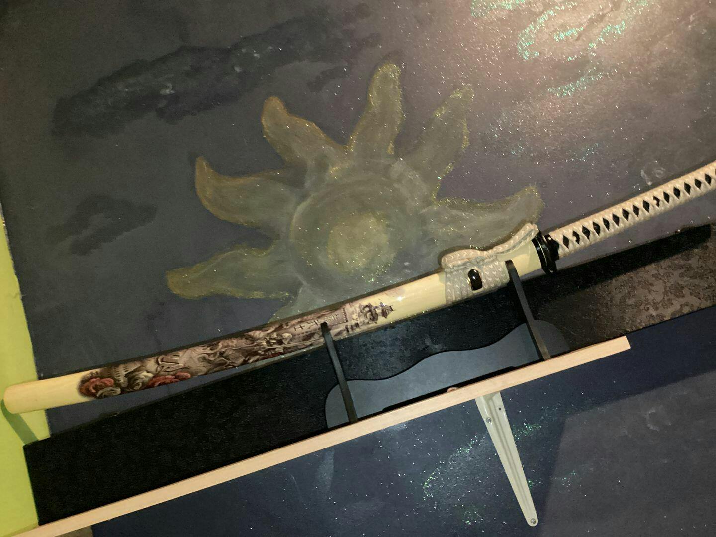 Skida (Saya 鞘) : Den lackerade träskidan Saya är utsmyckad med illustrationer som visar historiska scener och ger en konstnärlig inblick i Edo-perioden. Denna tidskapsel är både ett dekorativt element och en tyst lärare om Japans rika kultur.